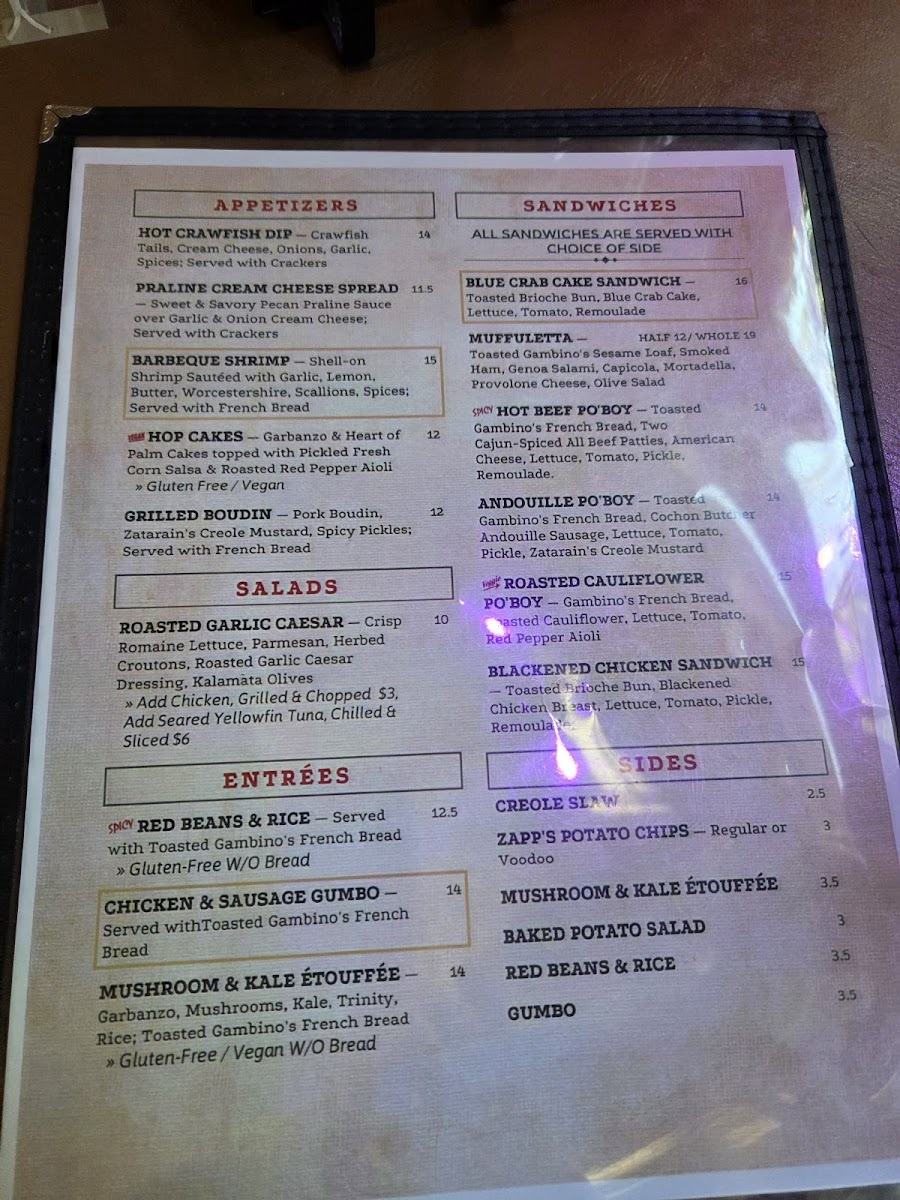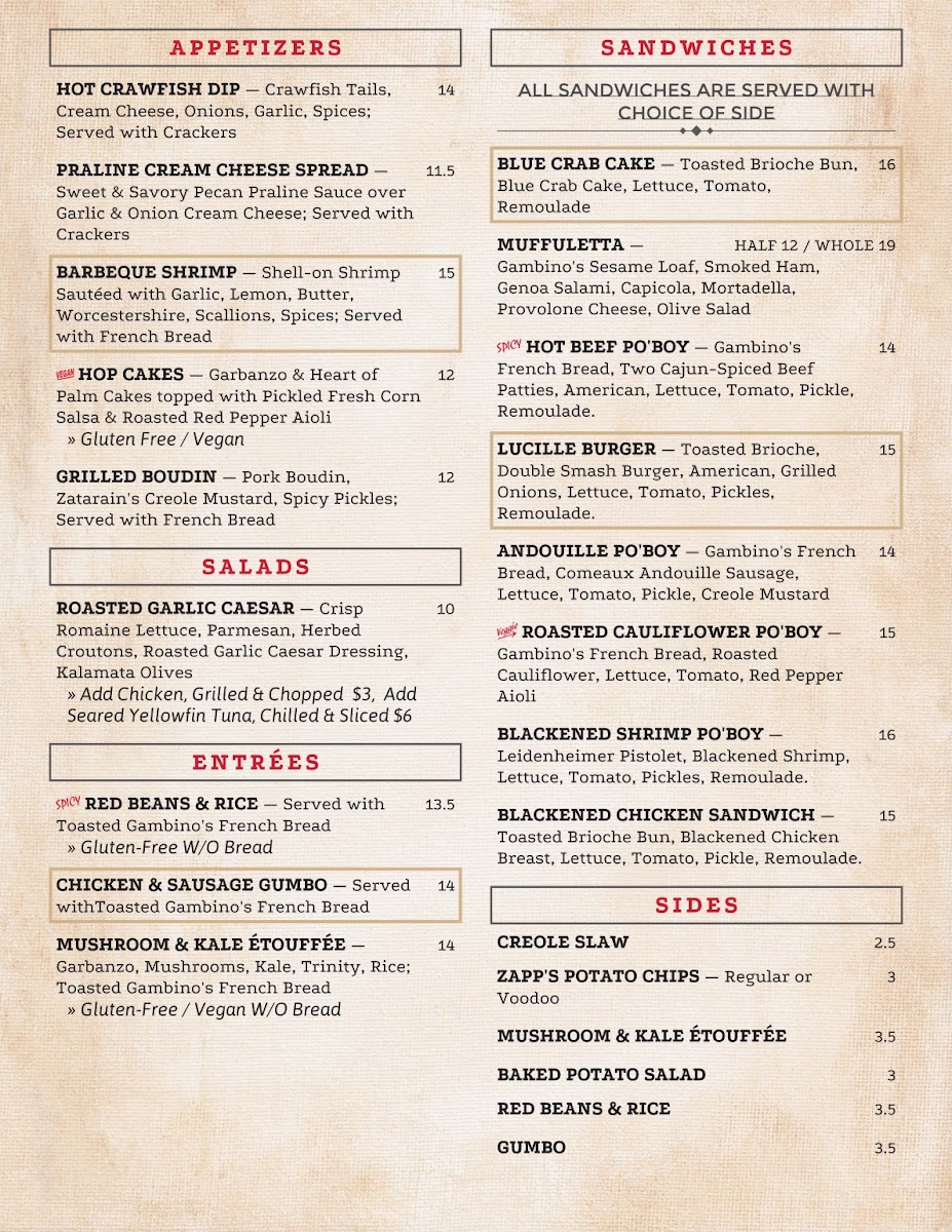 Red beans, smoked sausage, tasso, trinity, rice. Served with French bread. Gluten-Free without bread.